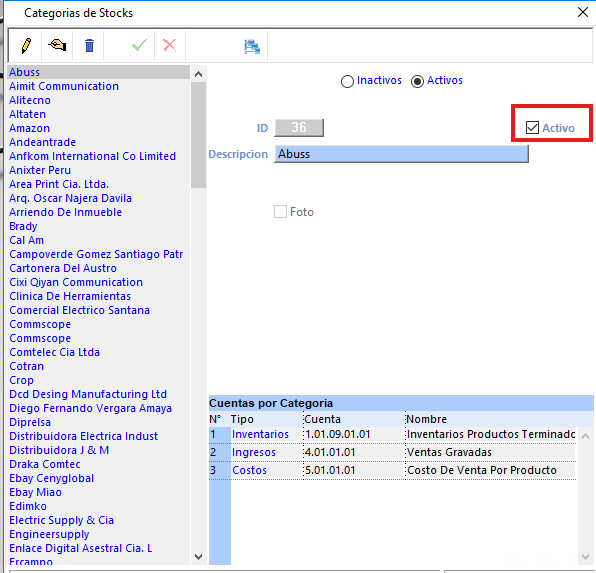 - Categoría: En la ventana de Categoría se actualizó el diseño, ahora incluye una opción que permite activar o desactivar una categoría fácilmente.