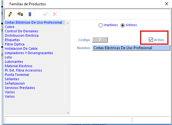 - En la familia, grupo y subgrupo podrá visualizar el campo para activar o desactivar.