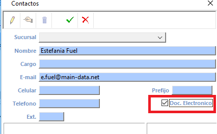 • Cuando el contacto esté marcado con el visto de DOC ELECTRÓNICO se enviará el correo con adjunto del PDF y XML a clientes y proveedores.